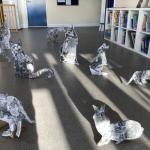 Following on from a previous session in which children aged 7, 8 and 9 used the grid method to scale up simple drawings, in this session the children developed their drawings through collage and construction to transform them into sculptures.