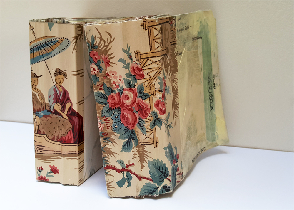 I have always enjoyed making sketchbooks and when Andrea Butler dropped off some lovely wallpaper sample books it seemed like a good sketchbook-making opportunity. As part of the process of making the sketchbooks I overlaid the patterned paper with acrylic paint, both to tone down some of the wallpaper and also to create a surface upon which pens and pencils would work easily, however the original patterns still show through, making each page of the sketchbook unique and getting rid of that horrible “white page” syndrome. Instead each new sketchbook page inspires with its texture and colour.