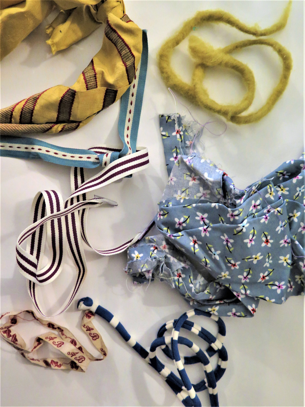 Haberdashery: Assorted fabrics off-cuts, ribbons, pom-poms, braiding, wool, cottons, needles