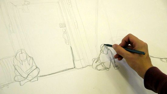 Repeat the activity in Exercise One – Continuous Line Drawing of a Space, this time concentrating on drawing the people which inhabit the space. Remember not to take your pencil off the paper as you draw the people. Think carefully about where on the page to start drawing the people – where in the space do they exist?