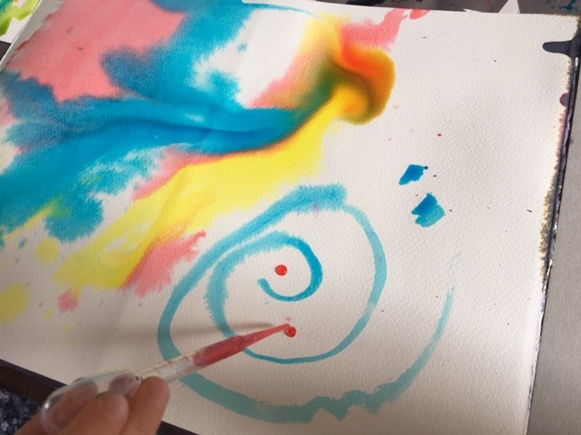 Next, use pippets (or brushes) to drop colour onto the dampened paper – and wait for the magic to happen!