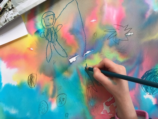 Then, using a range of drawing materials (my daughter mainly used simple colouring pencils as they have a lovely chalky quality over the top of dried water colour paper) draw your space picture! This is really an opportunity to let your child use their imagination and explore the composition of the page. Allow them to draw what comes to mind, only steering them towards discussions about space rather than dictating what they draw. My daughter was particularly drawn to a photo of an astronaut in the book we looked at and so wanted to re create that.