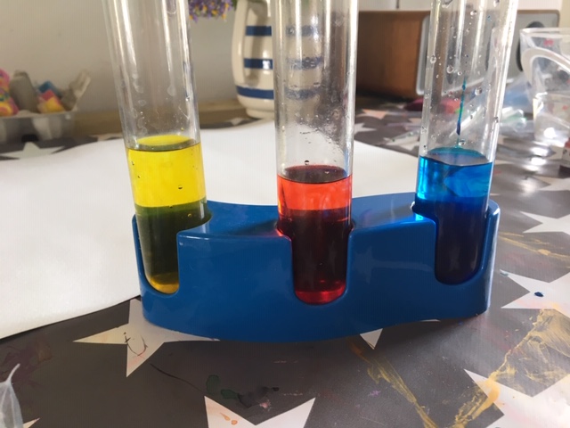 Then, we used the test tubes to mix our colours. This proved an engaging part of the process as we could use a small funnel and jug of water to first add some water into each tube, followed by some drops of food colouring. Inks or water colour paint work equally well here though.