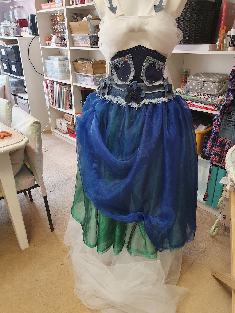 We used blue and green organza for the skirt, representing the sky and trees from the painting. Psyche’s home was important to her. The underneath of the dress is soft, white tulle showing Psyche’s soft innocent side. A stark contrast to the tough denim armour of her dress. Love hearts and arrows depict Cupid and his love for Psyche, the arrows sign-posting where to go (and as a back-up in case she needed to use them).