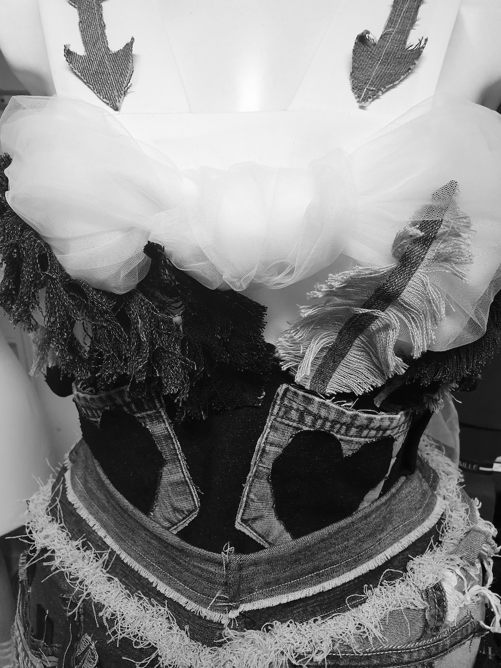 ‘We chose denim fabric to show resilience because your jeans go through a lot. We distressed and deconstructed denim making feathers and tassels.’