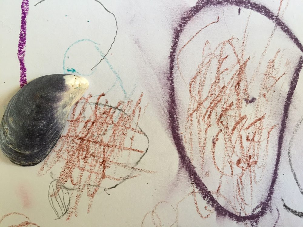 See what your child’s instinct is in terms of how they begin their drawing. If they first draw small, and replicate the real size of the shell – encourage them to go bigger.